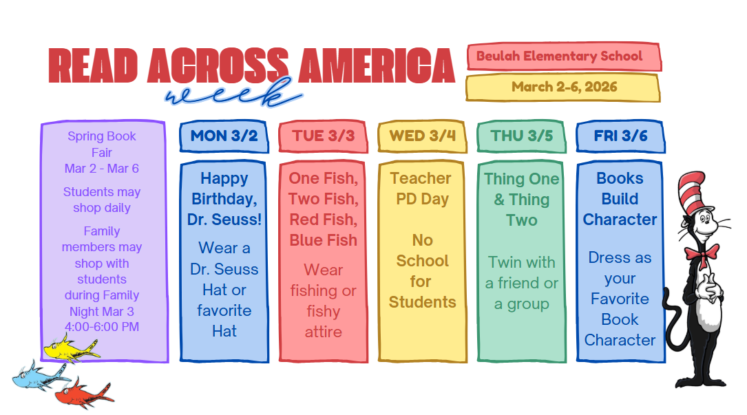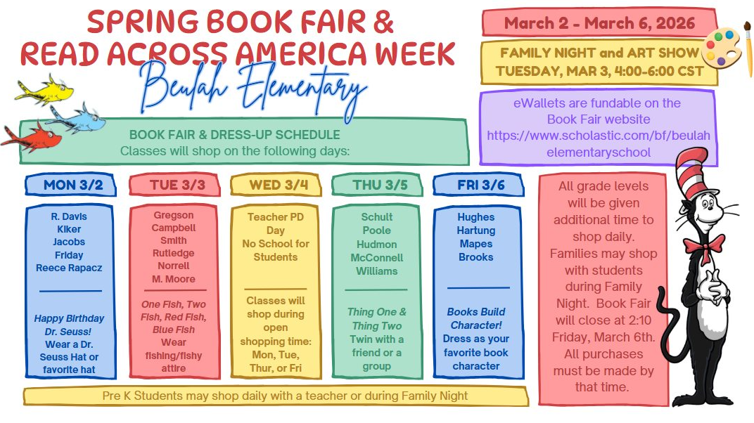 Book Fair and Read Across America Week, March 2-6, 2026 Are you ready for the best week of the year? Do you have your Read Across America attire ready? Have you funded your Book Fair eWallet? https://www.scholastic.com/bf/beulahelementaryschool February 24, 2026