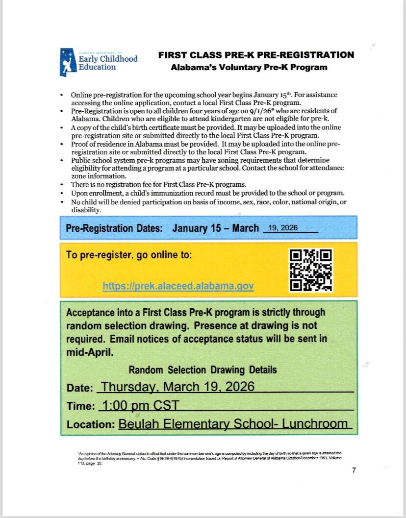 Beulah Elementary School Pre-K Lottery Drawing Beulah Elementary’s Pre-K lottery drawing will be Thursday, March 19, 2026 at 1:00 CST, in the cafeteria. February 9, 2026